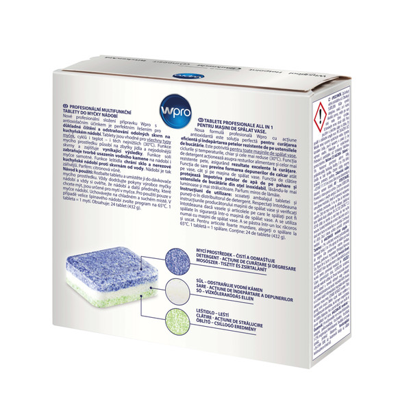 Profesionálne tabletky do umývačky riadu Wpro s antioxidačným účinkom sú dokonalým riešením pre dôkladné čistenie a odstraňovanie aj veľmi odolných nečistôt z riadu. Sú vhodné pre všetky typy umývačiek riadu, cykly a teploty, dokonca aj tie najnižšie (30°C). Čistiaca schopnosť umývacieho prostriedku pôsobí na zbytky jedla a odolné nečistoty a zabezpečuje dokonalé výsledky umývania. Prítomnosť soli bráni tvorbe usadenín vodného kameňa na riade a umývačke. Leštidlo chráni sklo a nerezový riad proti škvrnám od vody a zanecháva riad jasnejší a žiarivejší. Balenie: 24 tabliet pre 24 umývaní.