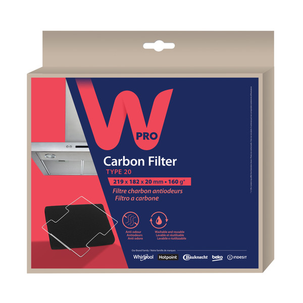 Umývateľný uhlíkový filter Wpro zachytáva znečistený vzduch pri varení a eliminuje zápachy v kuchyni. Vďaka absorbčnému pôsobeniu bráni šíreniu baktérií vo vzduchu. Uhlíkový filter Wpro je vybavený indikátorom nasýtenia, ktorý zmení farbu, keď je potrebné filter vymeniť. Pre dosiahnutie optimálneho výkonu doporučujeme meniť filter každé 3 mesiace. Uhlíkový filter Wpro je potrebné pri bežnom používaní odsávača čistiť raz za mesiac. Filter sa môže umývať aj v umývačke riadu pri najvyššej teplote s použitím umývacieho prostriedku. Po umytí filter sušte 10 minút v rúre pre teplote 100°C, aby sa reaktivoval. Upozornenie: neprekračujte uvedenú teplotu a dobu sušenia v rúre. Filter je plne funkčný 3 roky. Typ 20 LongLife (219 x 182 x 20 mm - 160 g).